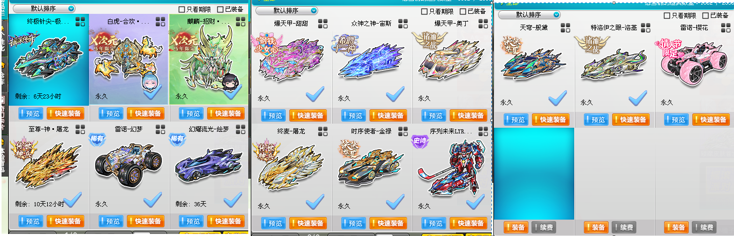 至尊火麒麟招财玉如意皮肤双四级宝石改装全29; 至曜影虎合欢琉璃主皮肤双四级宝石改装全29; 爆天甲甜甜奥丁皮肤双四级宝石改装全29; **麦凯伦屠龙双四级宝石改装全29; 特洛伊之眼洛基双四级宝石改装全29; 众神之神宙斯双四级宝石改装全29; 天穹般黛、时序使者金禄、雷霆机甲