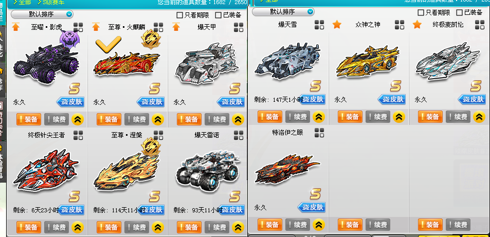 • S车:至尊火麒麟招财玉如意皮肤、至曜影虎合欢琉璃主皮肤、爆天甲甜甜奥丁皮肤、**麦凯伦屠龙、特洛伊之眼洛基、众神之神宙斯